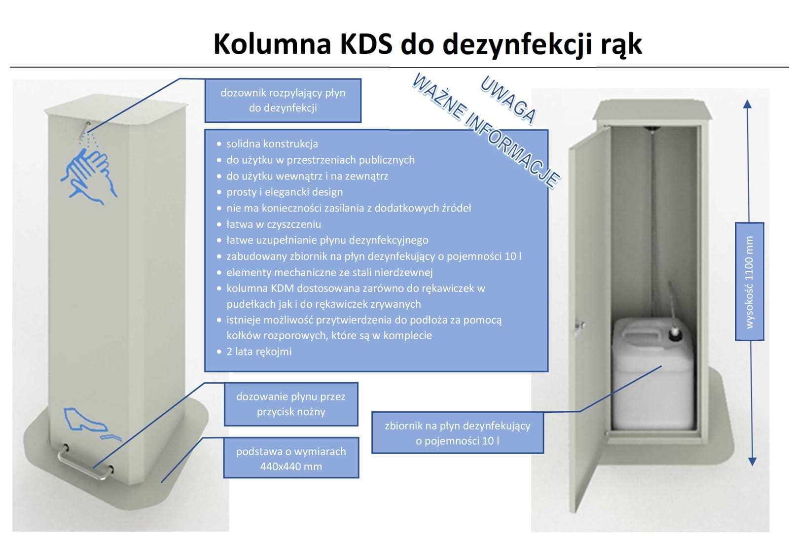 Kolumna KDS - umożliwia nożne dozowanie płynu do odkażania rąk.
