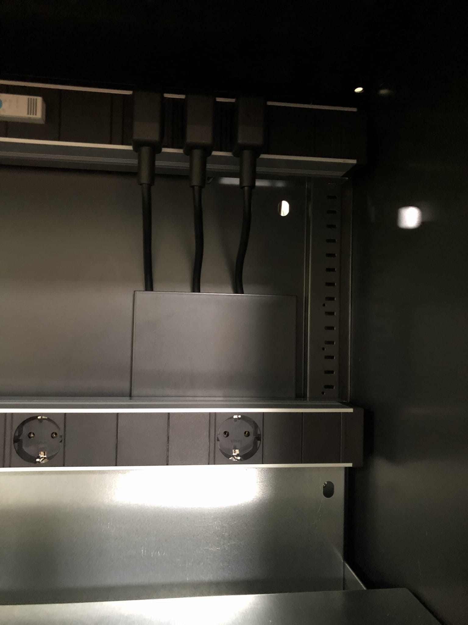 Specjalna na stałe zamontowana E-półka, ze zintegrowaną listwą gniazd elektrycznych dla zachowania porządku