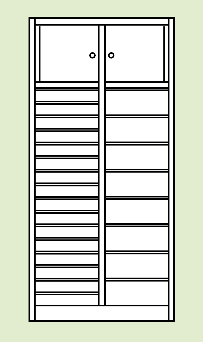 ■ Po każdej stronie skarbczyk z zamkiem cylindrycznym, poniżej 16 małych szuflad, po prawej 8 dużych szuflad