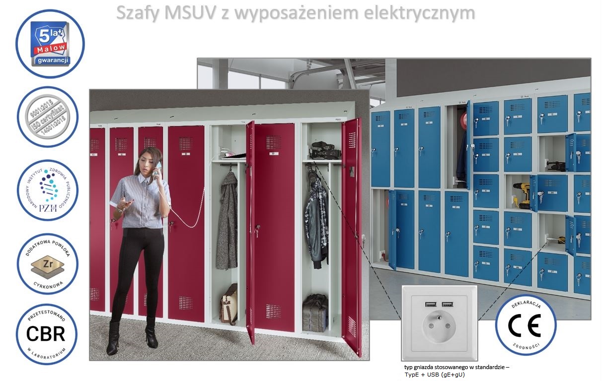 Szafa MSUS to rodzina szaf socjalnych wyposażonych w gniazda elektryczne z dodatkowo dwoma portami USB do ładowania urządzeń elektrycznych i elektronicznych. Szafa skrytkowa MSUS idealnie wpisuje się jako element wyposażenia szatni szkół, bibliotek, klubów sportowych, fitnessów.