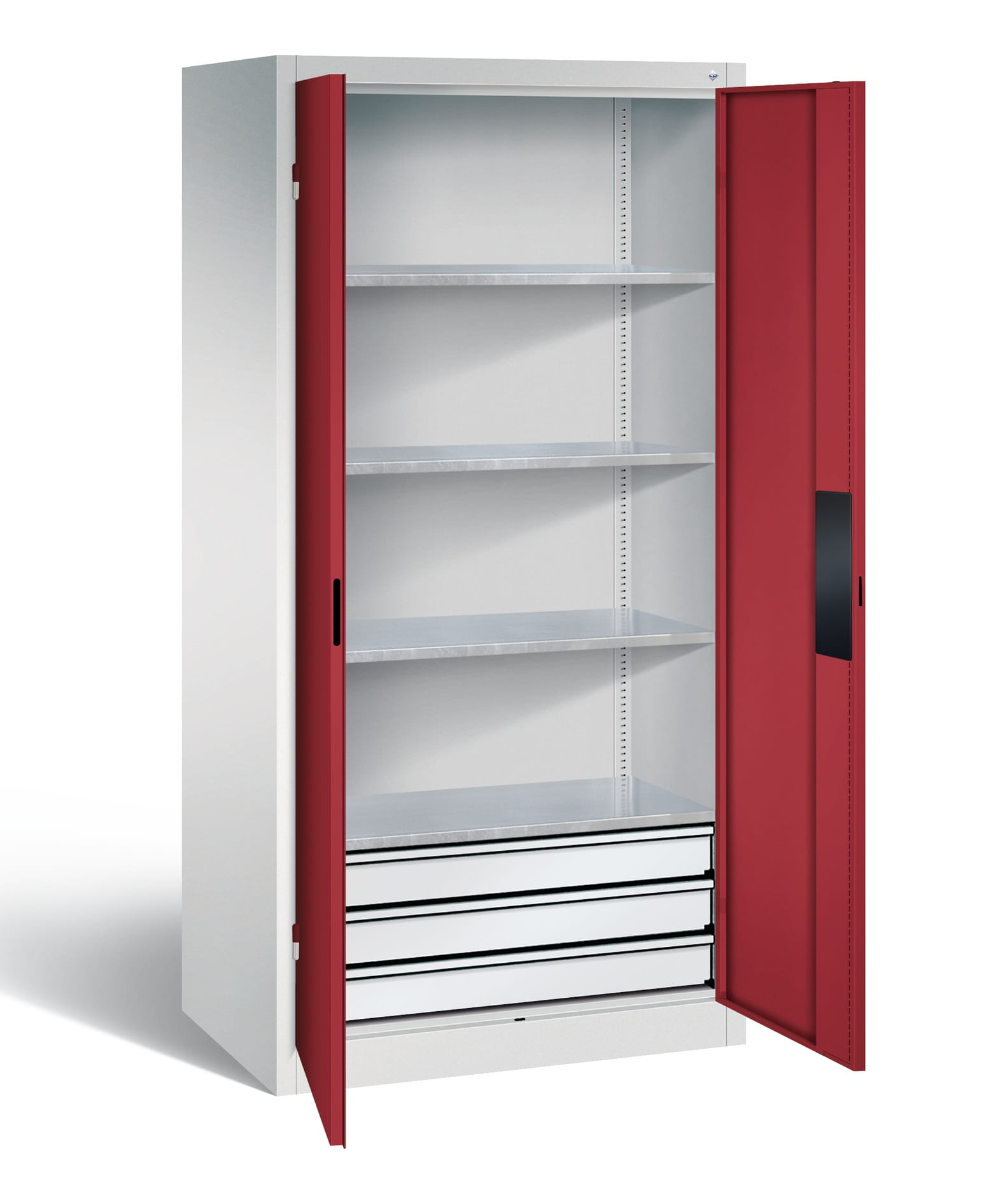 3 szuflady na prowadnicach teleskopowych z pełnym wysuwem, obciążenie 75 kg, powyżej 4 półki. Przy obciążeniu szuflad konieczność mocowania do ściany.