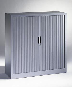 Metalowa szafa aktowa z drzwiami żaluzjowymi. Wymiary: W 1345 x S 800 x G 420 mm - 3,5 rzędów segregatorów. Korpus wykonany z podwójnej blachy stalowej, każda warstwa o gr. 1,0-0,8 mm pokrywana farbą proszkową, bezgłośnie pracujące drzwi żaluzjowe z tworzywa sztucznego, otwierane poziomo, w pełni chowane w korpusie szafy, zamek cylindryczny z 2 kluczykami, wewnątrz 4 metalowe przestawne półki, przystosowane do zawieszania teczek A4, nośność półki ok. 50 kg przy równomiernym rozłożeniu ciężaru.