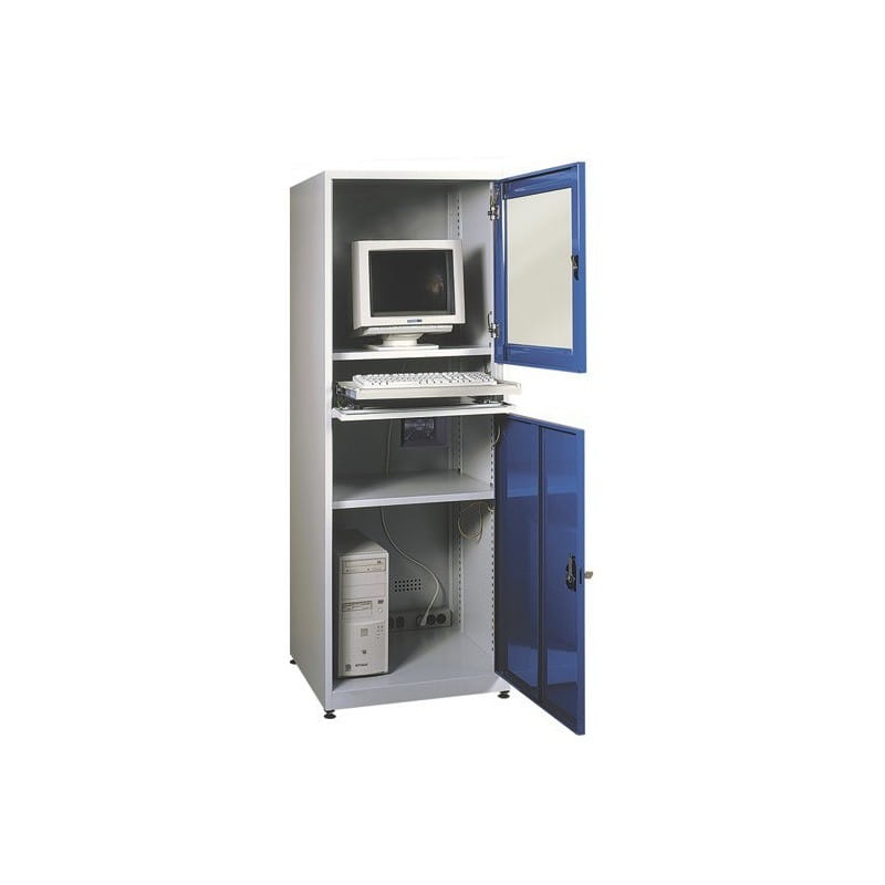 Metalowa szafka pod komputer posiada część chroniącą klawiaturę,otwierana jednocześnie z drzwiami głównymi. Dodatkowe miejsce na myszkę.